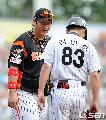 [OSEN=잠실,이대선 기자] 4일 '2011 롯데카드 프로야구' LG 트윈스와 롯데 자이언츠의 경기가 잠실야구장에서 열렸다. 2회말 1사 1루 LG 김태완의 내야안타때 롯데 이대호가 김인호 코치와 이야기를 나누고 있다. / sunday@osen.co.kr