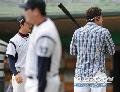4일 인천구장에서 열릴 예정인 프로야구 두산과 SK의 경기를 앞두고 양준혁 SBS 해설위원이 훈련중인 두산 선수들을 지켜보고 있다. 배팅볼을 치던 두산 투수 정재훈의 배트를 받아든 양준혁이 타격 자세를 취하고 있다. 인천=정재근 기자 cjg@sportschosun.com/2011.09.04/